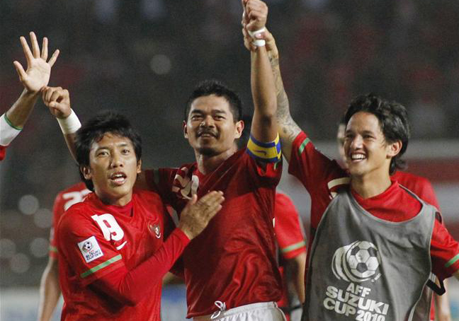 (L-R) Indonesia's Ahmad Bustomi, Bambang Pamungkas and Irfan Haarys Bachdim celebrate after beating Thailand during their qualifying round soccer match at the 2010 ASEAN Football Federation (AFF) Cup soccer tournament in Jakarta December 7, 2010. REUTERS/Supri (INDONESIA Picture Supplied by Action Images)