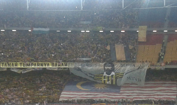 Jujur, situasi itu membuat saya yang bertindak sebagai tamu (meski bukan pemain) merinding. Dengan kemiringan tribun yang curam plus warna dominan kuning-hitam, Stadion Bukit Jalil menyerupai Westfalen (Signal Iduna Park) yang menjadi kandang Borussia Dortmund. Para penonton tak ubahnya lebah-lebah yang siap menyengat dan meneror pemain lawan yang coba mengganggu sarangnya. Sebuah teror bagi setiap tim yang datang.